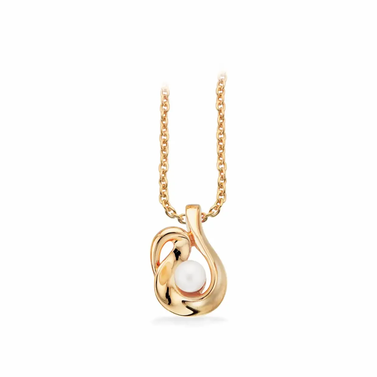 Flot vedhæng i 8 karats guld med en hvid ferskvandsperle, medfølgende halskæde i forgyldt sølv.