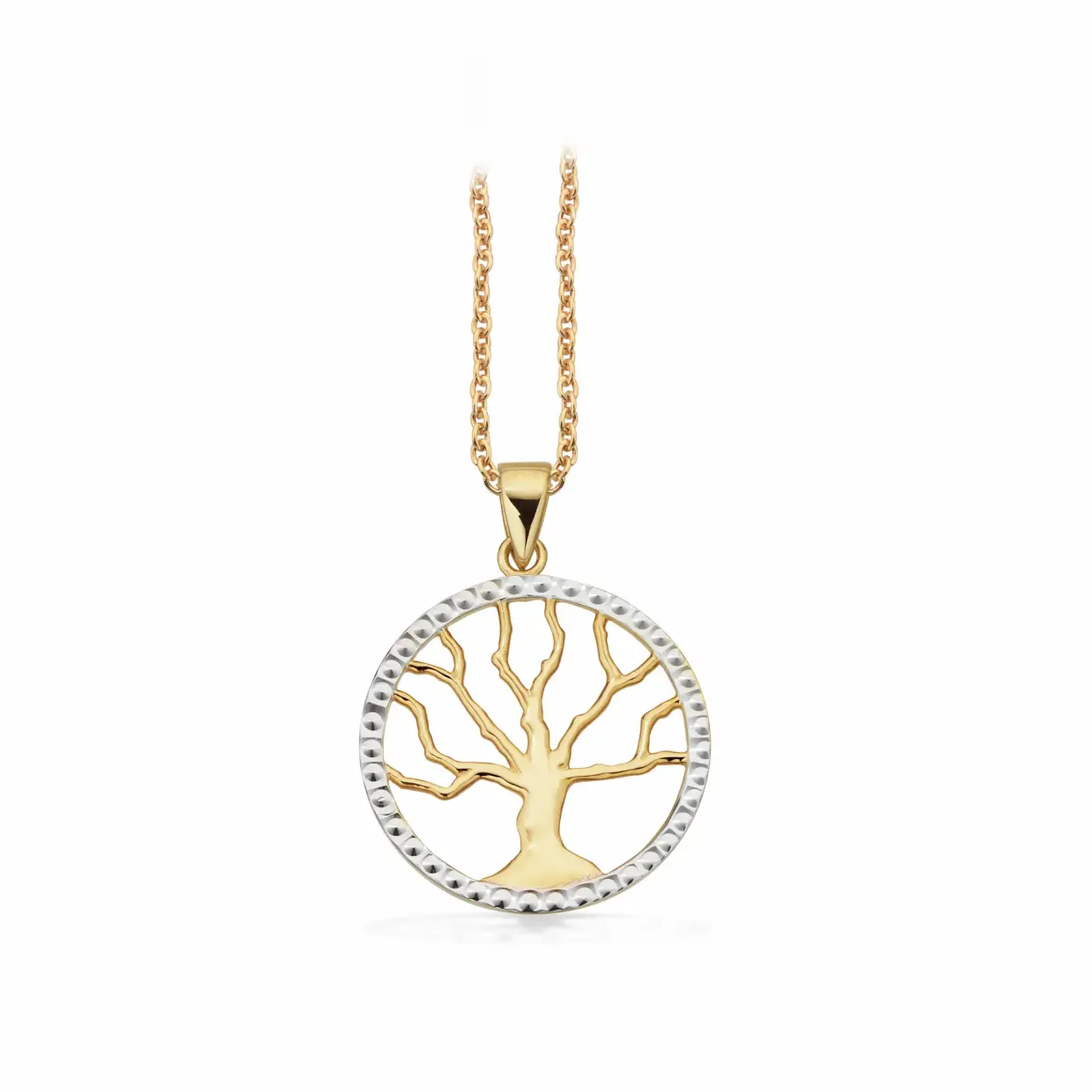Livets træ vedhæng lavet i 8 karats rødguld, vedhænget har en 8 karats hvidgulds kræns omkring træet. Vedhænget har en medfølgende forgyldt sterling sølv kæde med.