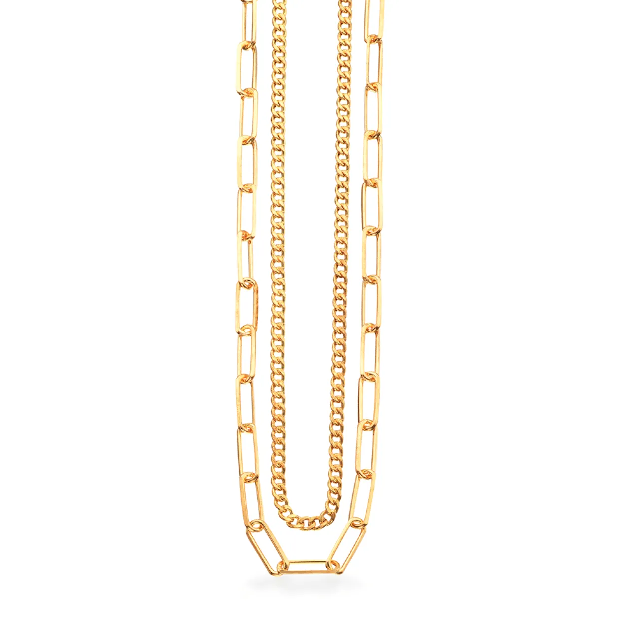 Sølv forgyldt halskæde som er to rækket. En er med mønsterret panser og den anden er med lange led. Kæden er 42 cm da den skal sidde tæt ved halsen.