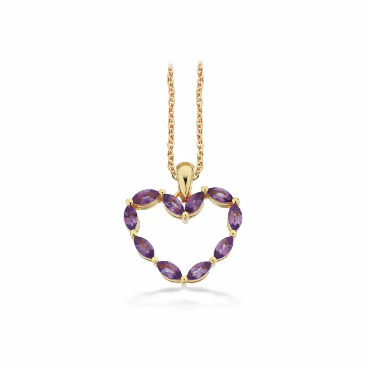 Halksæde lavet i 925 sterling sølv som er forgyldt, designet som et unikt hjerte med lilla zirkonia isat. Der medfølger en sølv forgyldt kæde i 45cm.