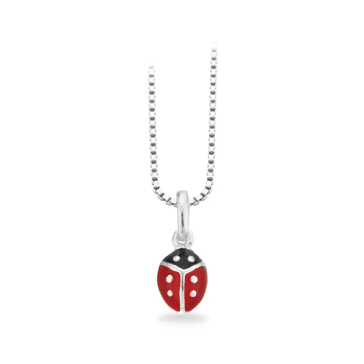 Sød og klassisk halskæde fra Scrouples. Halskæden er lavet ud af sterling sølv. Halskædens vedhæng er af en lille sød, rød og sort mariehøne.