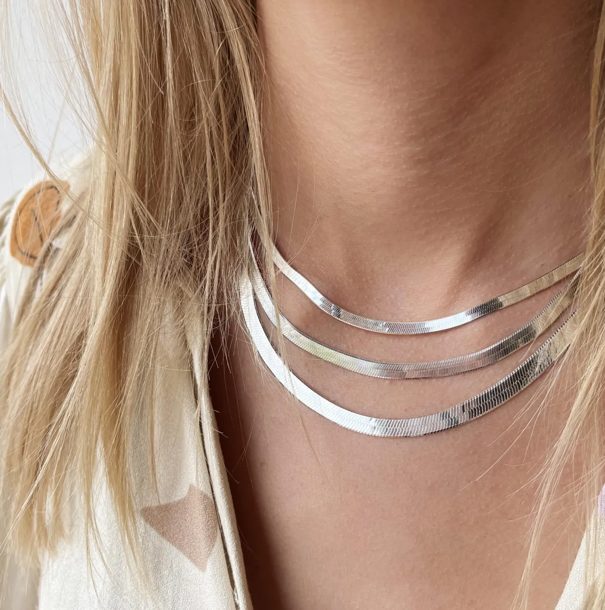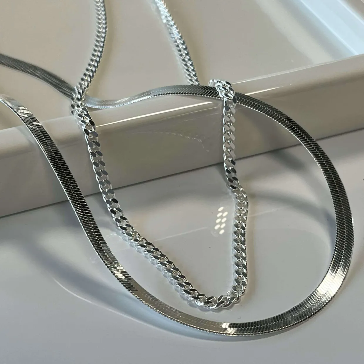 Denne smukke halskæde er fremstillet i sterling sølv. Halskæden er lavet i fladt slangekæde mønster og måler 3,6 mm i bredden og er 45 cm lang.