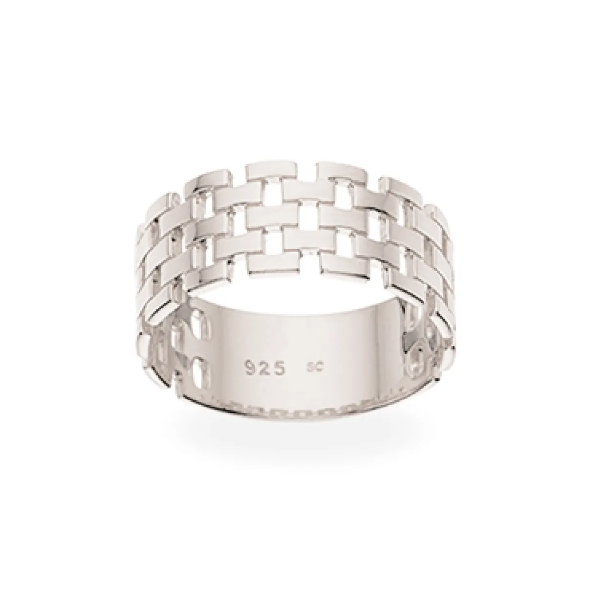 Denne flotte ring er fremstillet i sterling sølv og er blank og fin i overfladen. Ringen er designet i murstens mønster med 5 rækker. Notér i kommentarfelten hvilken størrelse du skal have ringen i når du bestiller den via vores webshop.