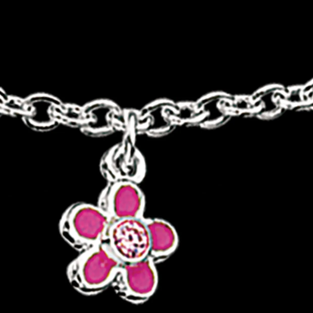 Fint lille børnearmbånd med et blomster vedhæng med pink sten og pink emalje.