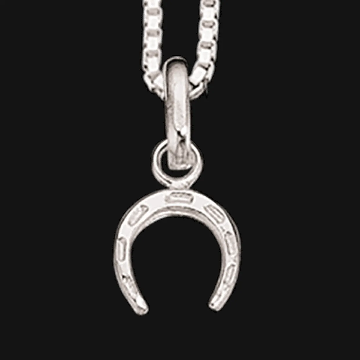 Sølv halskæde med hestesko. Halskæde er en børnekæde og selve hesteskoen betyder lykke. Til halskæde findes også øreringe til. Kæden er en venezia kæde.