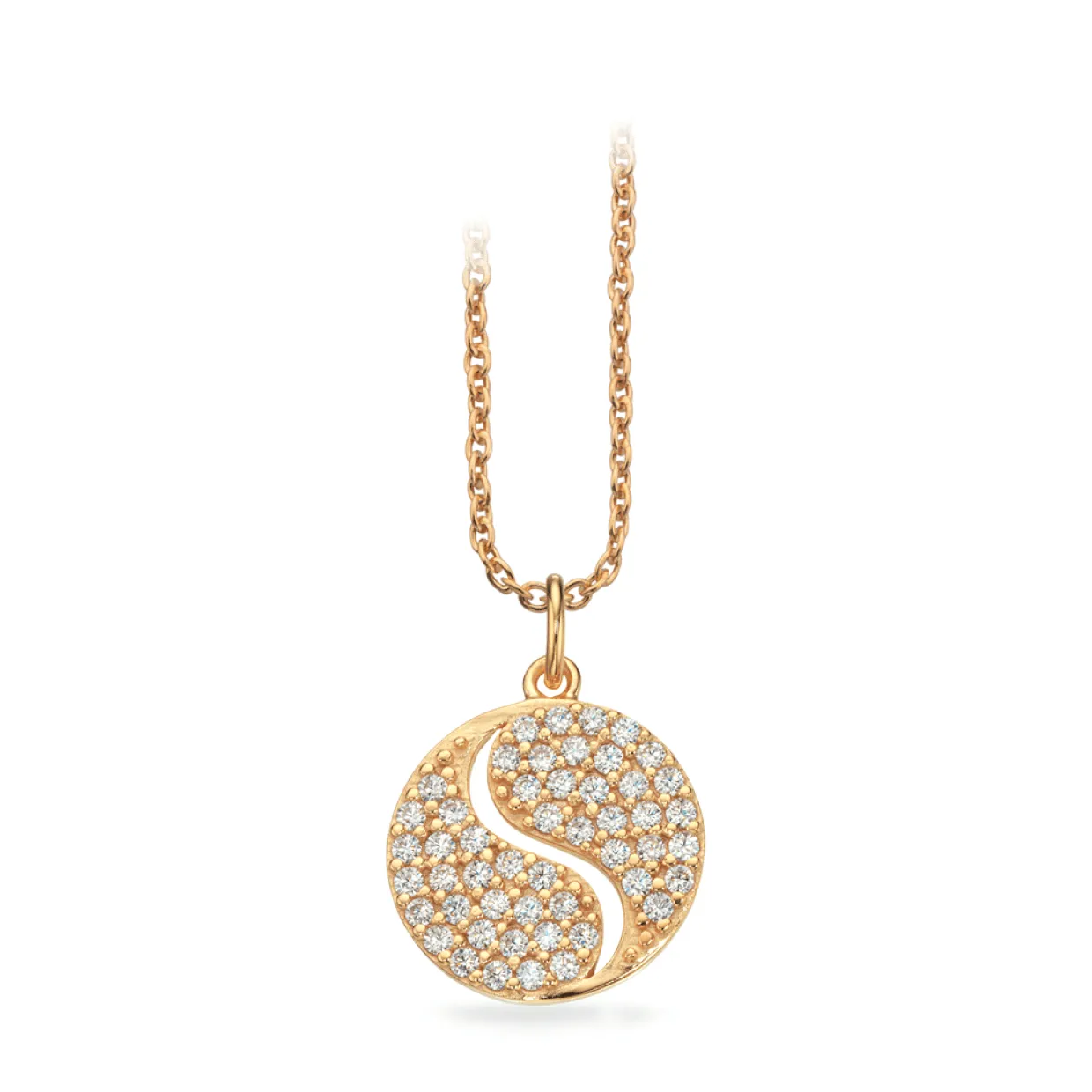 Sølv forgyldt halskæde med ying yang mønster. I vedhænget er der fyldt med syntetiske zirkonia. Kæden er en sølv forgyldt rund anker kæde i 45 cm, som kan ombyttes efterfølgende.