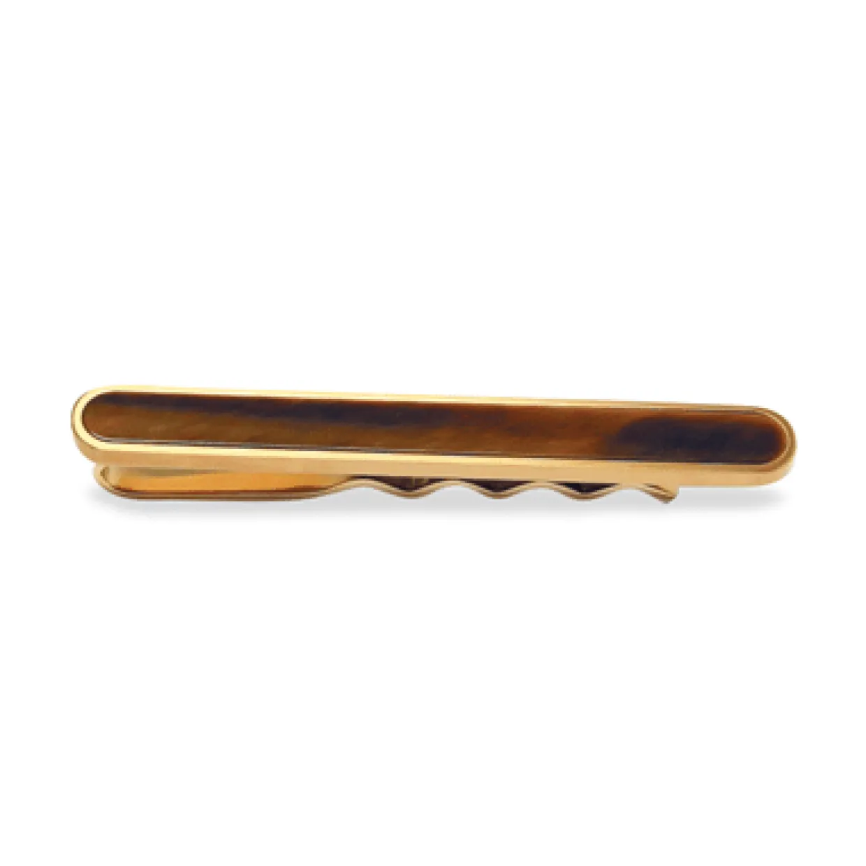 Stål forgyldt slipseholder med tigerøje. Slipseholderen er stål så den holder bedre om slipset. Tigerøje som er på forsiden giver et flot spil på det pågældende slips.
