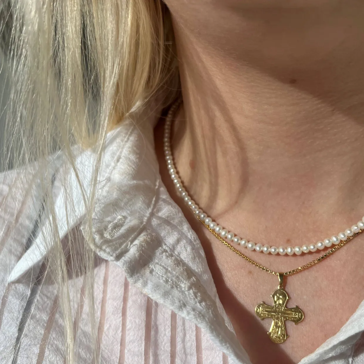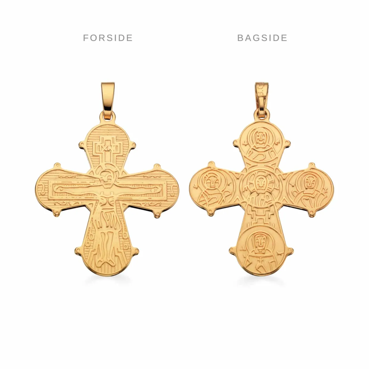 Disse sølv forgyldte dagmarkors er en meget klassik og tidsløs gave, de findes med tre forskellige motiver på bagsiden denne er med fadervor.