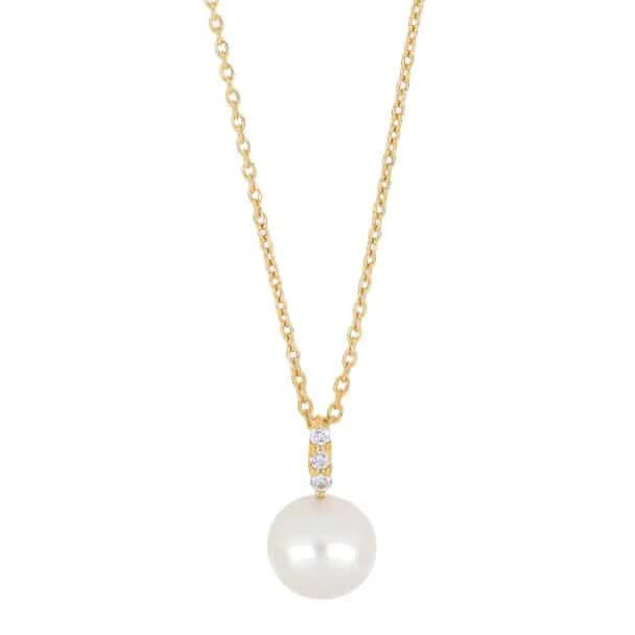 14 karat guld vedhæng med ferskvands kultur perle og brillanter på i alt 0,045 carat i kvaliteten wesselton/si. Til vedhænget medfølger en sølv forgyldt rund anker kæde i 45 cm, som kan ombyttes efterfølgende.