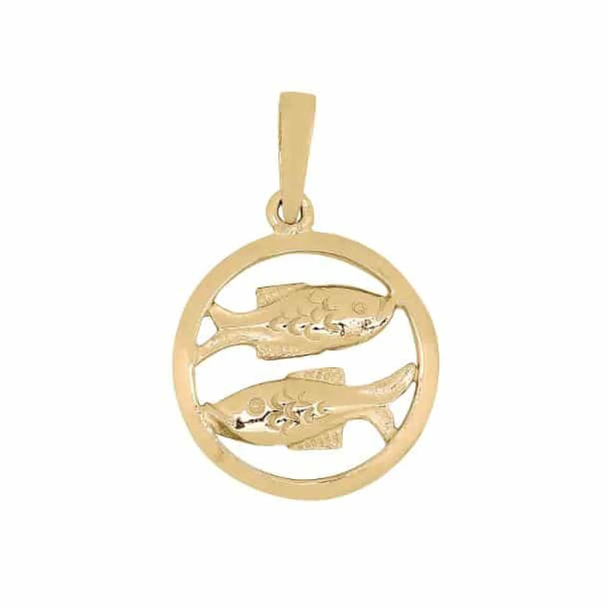 Dette vedhæng er lavet i forgyldt sterling sølv og måler 15 mm i diameter. Vedhænget er lavet som fiskens tegn i en cirkel.