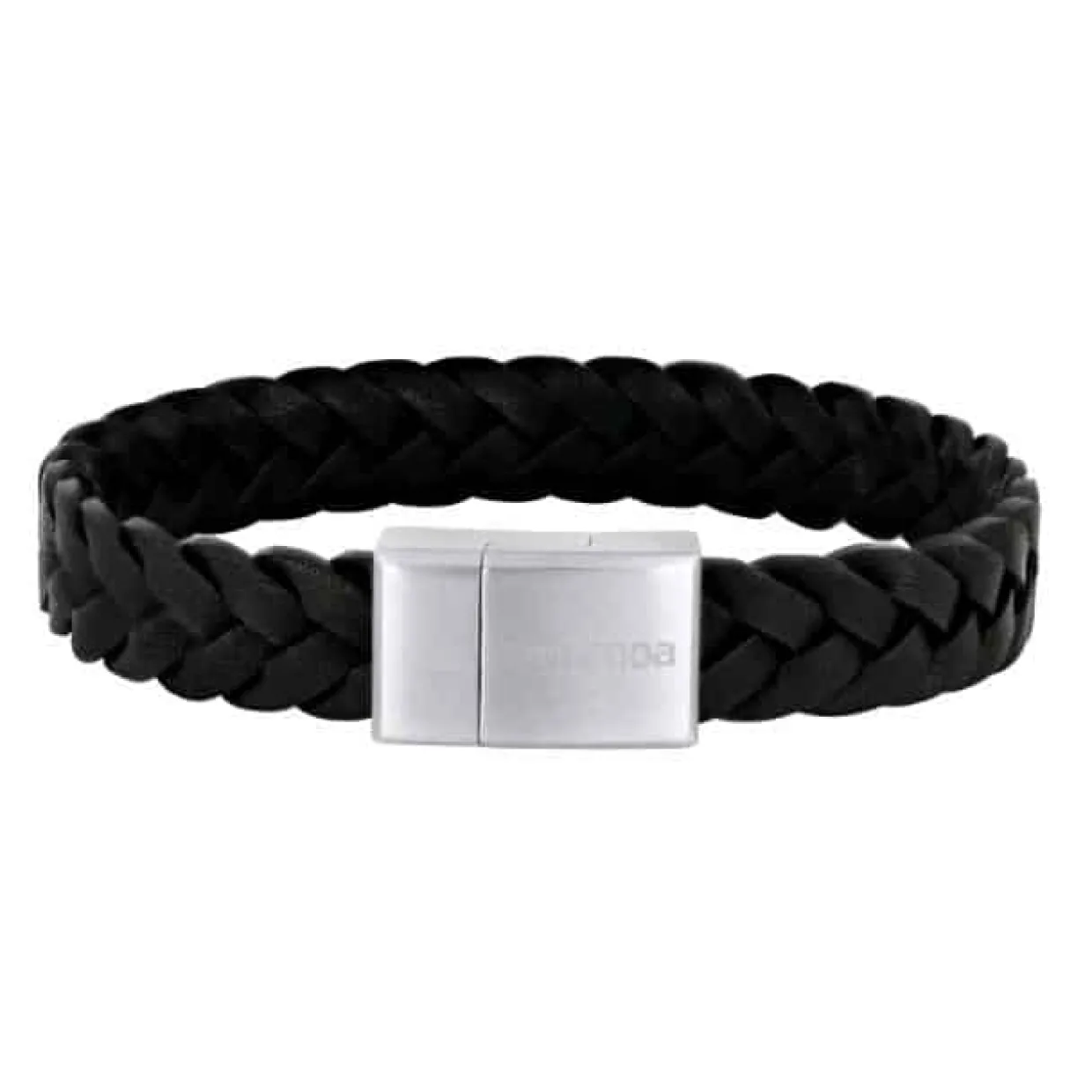 Dette flotte armbånd er fremstillet i sort kalve skind og en magnetisk lukning af stål. Armbåndet er flettet i læderet og 12mm i bredden og er 21 cm langt.