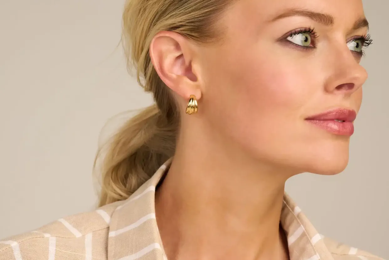 Emelda øreringen er fremstiller 925 sterling sølv der forgyldt med 18 karats guld med et rillet overflade og udformet som en halv creol med lås.