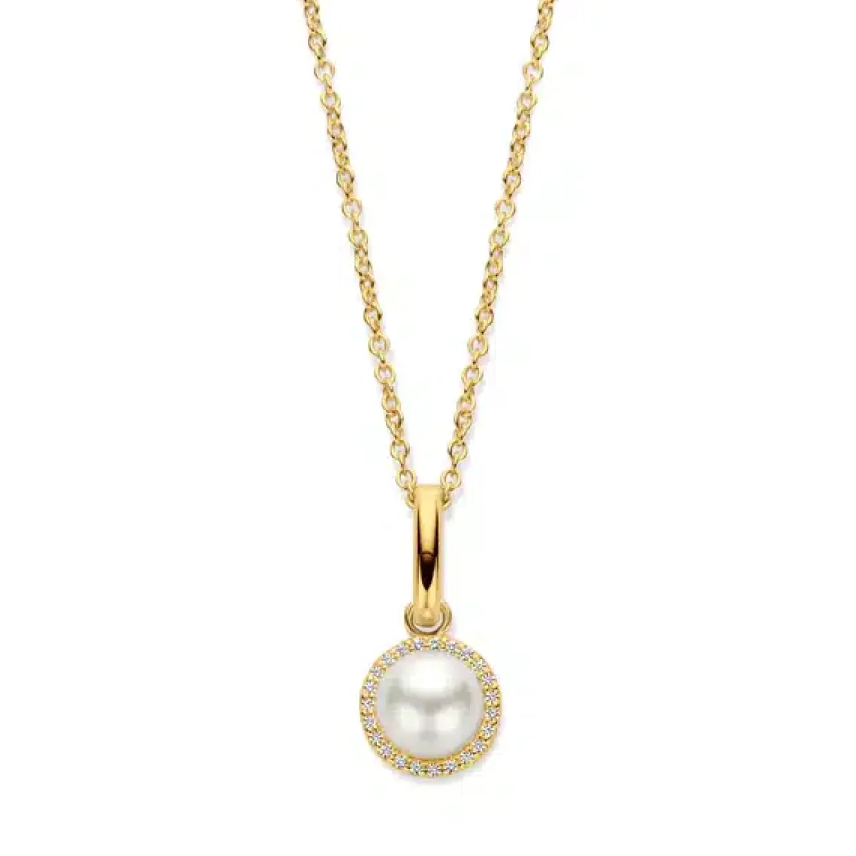 Halskæden er fremstillet 18 karaks forgyldt sølv, i vedhænget er der en hvid ferskvands perle med klare zirkoner rundt om formet som en cirkel.