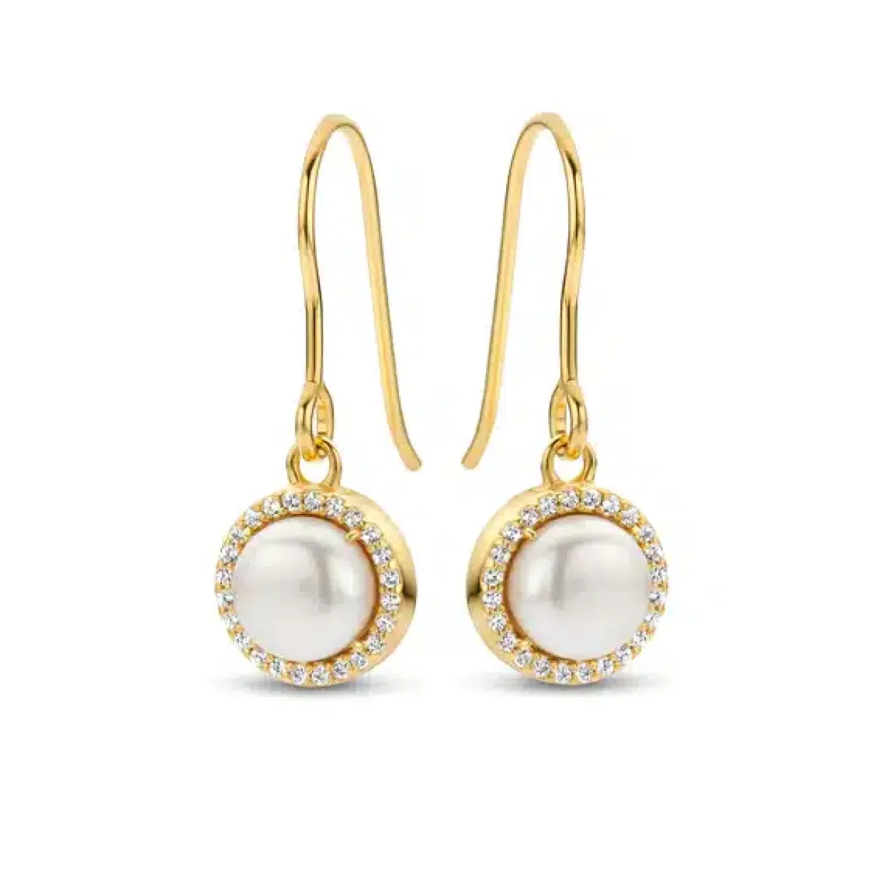 Ørehængerne er fremstillet i sterling sølv med en 18 karats forgyldning med ferskvandsperle med små zirkoner rundt om.