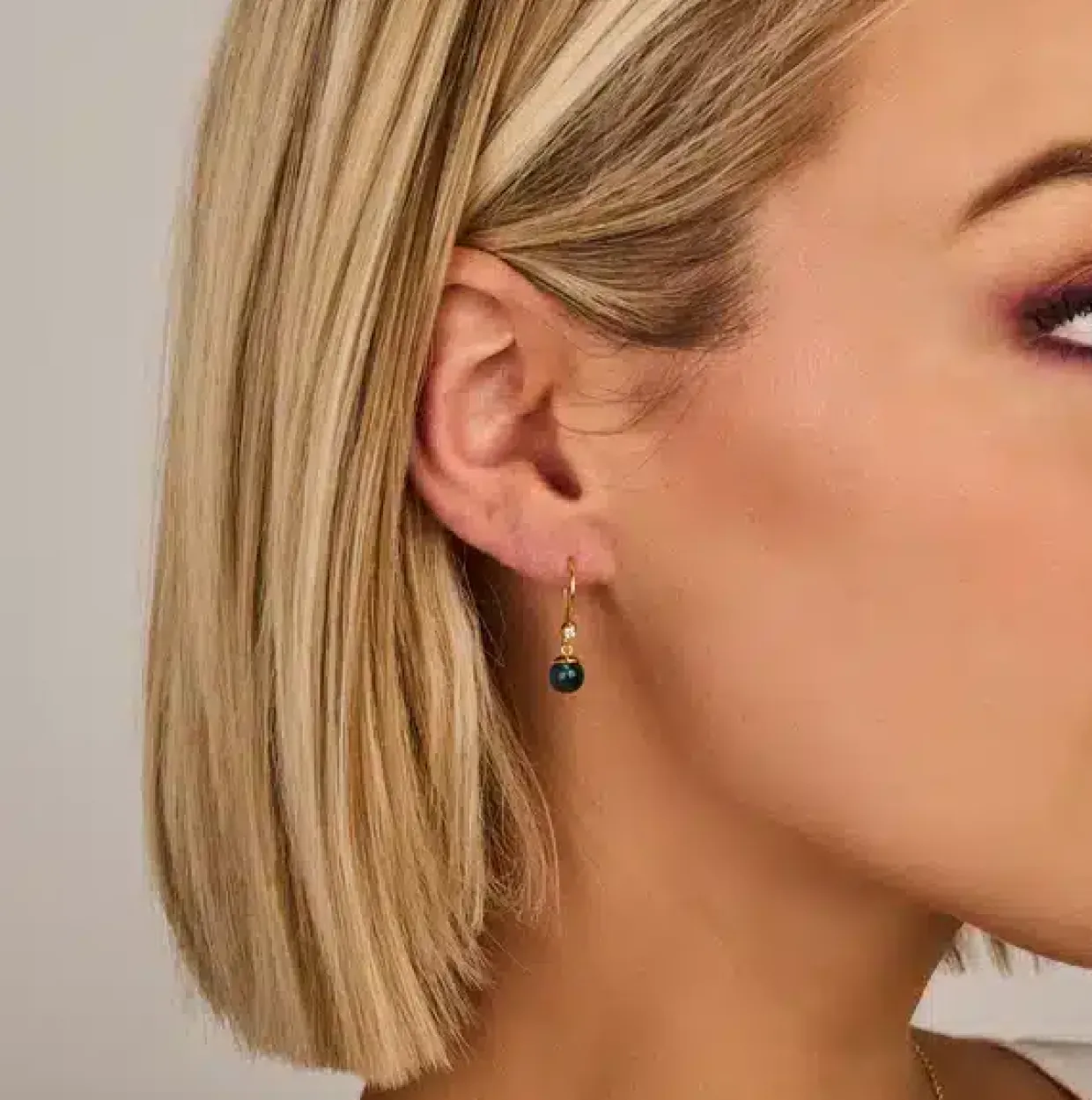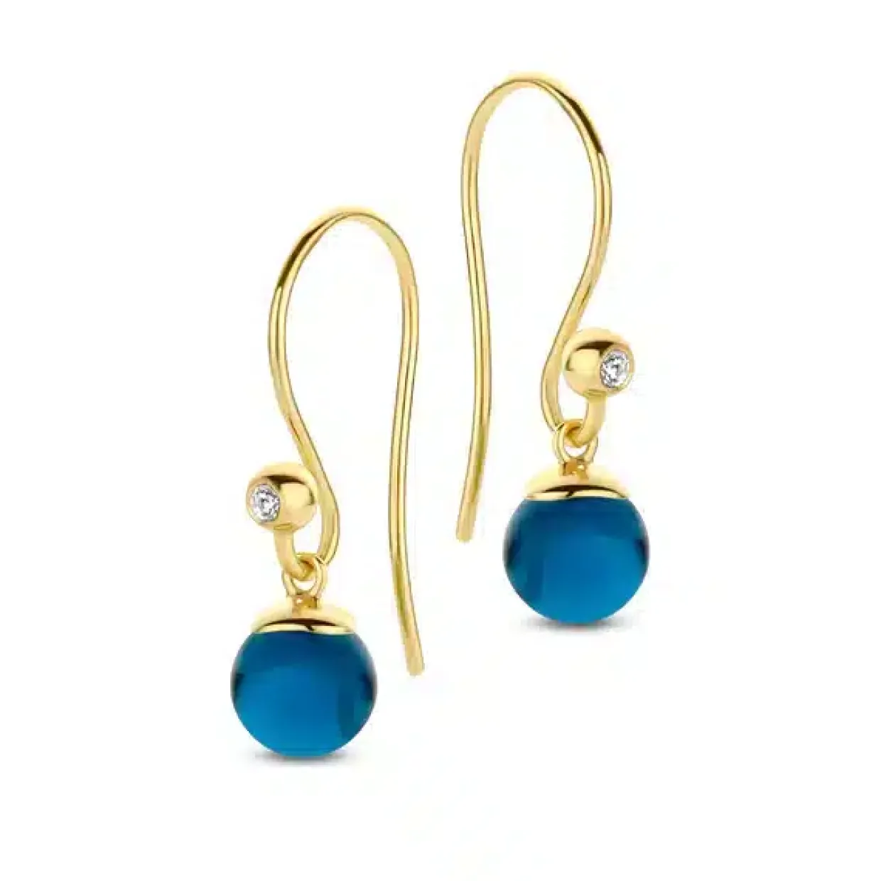 Ørehængeren er fremstillet i 925 forgyldt sterling sølv med zirkonia og 6mm blå kugle, den findes også med grøn sten og i sølv .