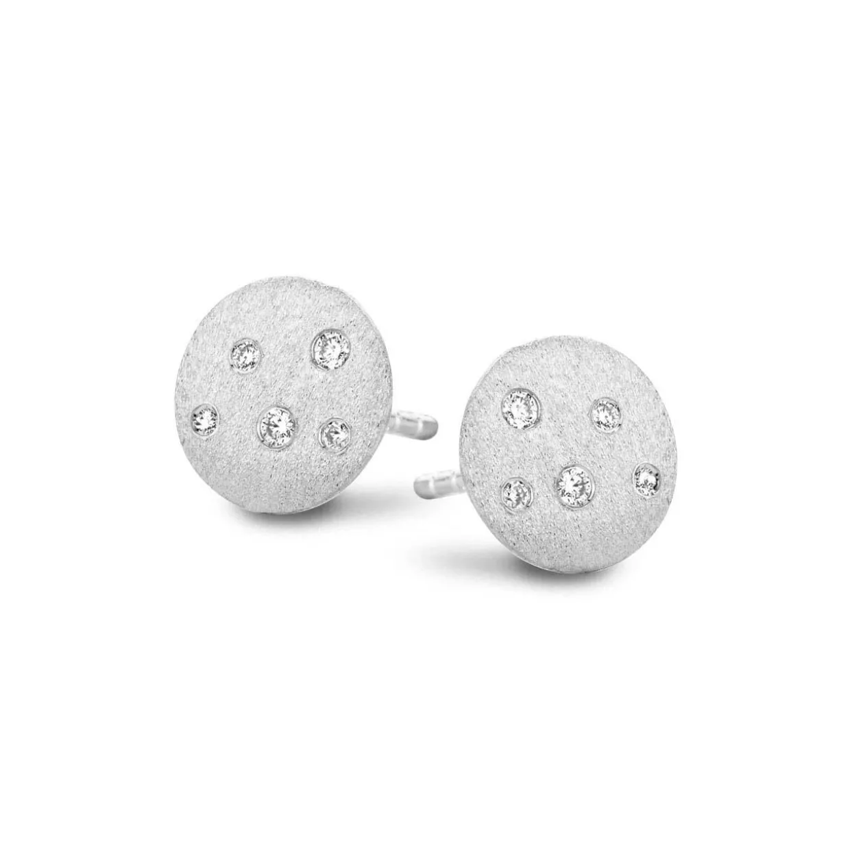 Ørestik i 925 sterling sølv, designet som en plade med matterede overflade og fem zirkonia på.