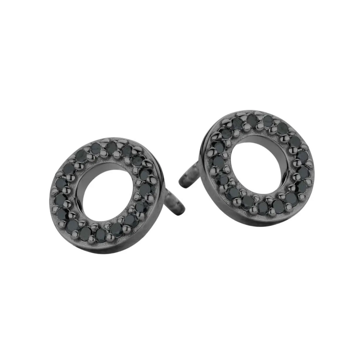 Disse Trend øreringe er udformet med en blankpoleret overflade i sort ruthineret sterlingsølv. Ørestikkerne, der er designet som små åbne cirkler, er paveret med sorte zirkonia og skaber et elegant udtryk.
