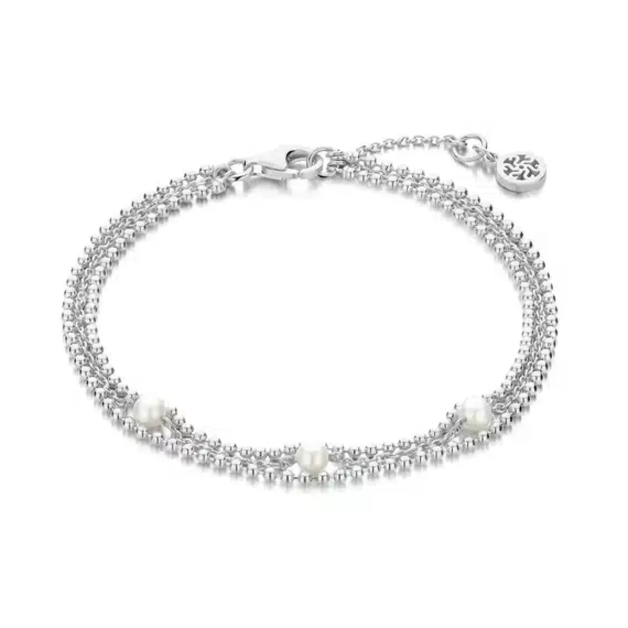 Armbåndet er fremstillet i 925 sterling sølv med hvide ferskvandsperler, bestående at 3 kæder sat sammen til et.