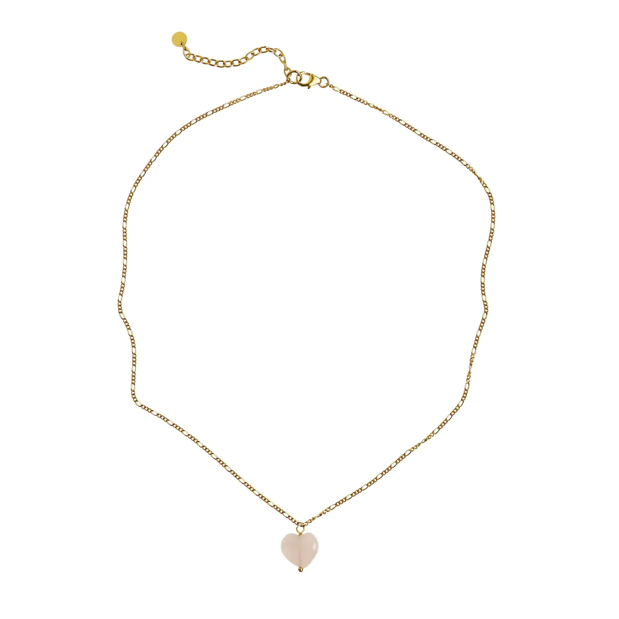 Halskæden er fremstillet i forgyldt sterling sølv med et lille rosakvarts vedhæng udformet som et hjerte.