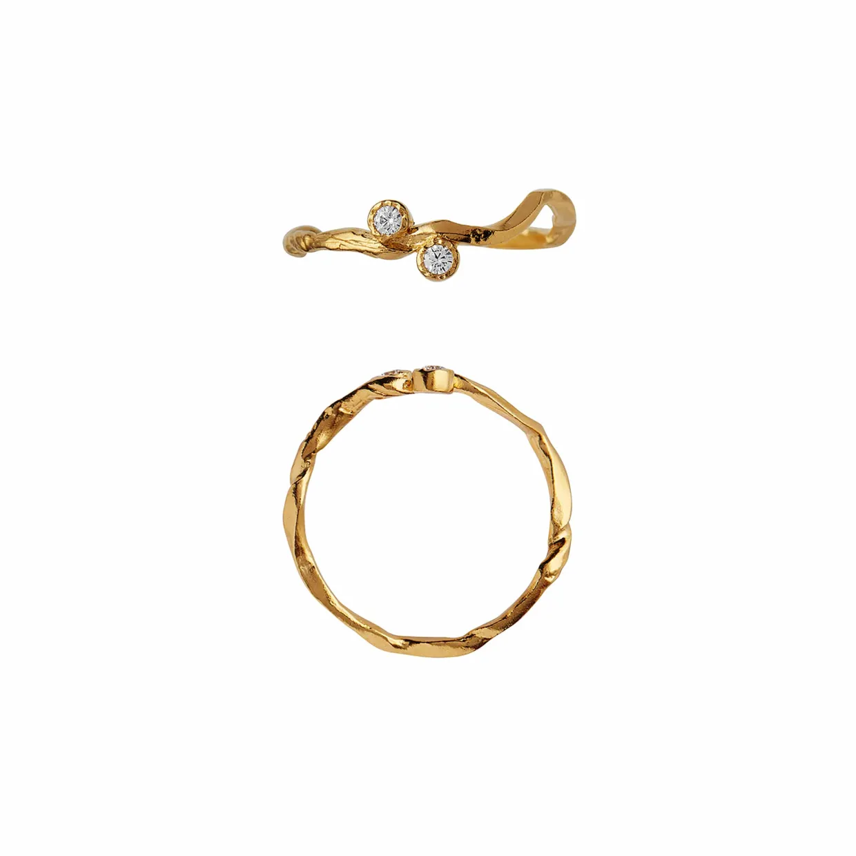 Organisk formet ring med 2 syntetiske zirkonia, der bølger på fingeren.