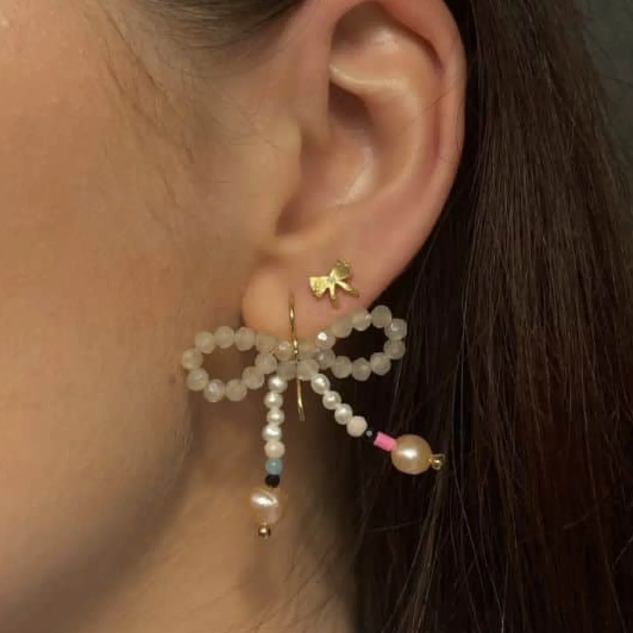 Sød sløjfe øreringe med hvide og lyserøde ferskvandsperler, sort onyx, blå agat og glasperler.