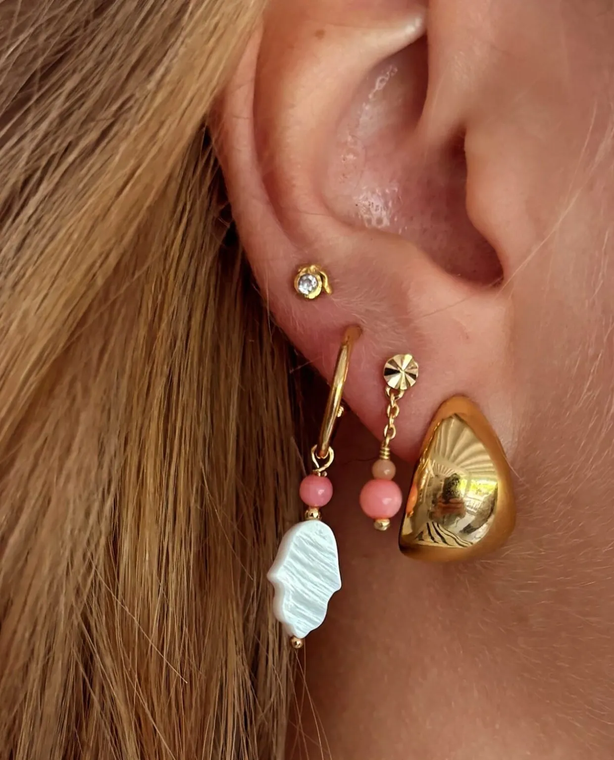 Fortryllende forgyldt creol-ørering med smukt coral- og perlemorvedhæng formet som en hamsa. Et symbol på beskyttelse og spiritualitet, der samtidig tilfører et strejf af feminin elegance. Bær den alene for et enkelt udtryk eller kombiner den i et magisk mix med andre øreringe for et personligt look.
