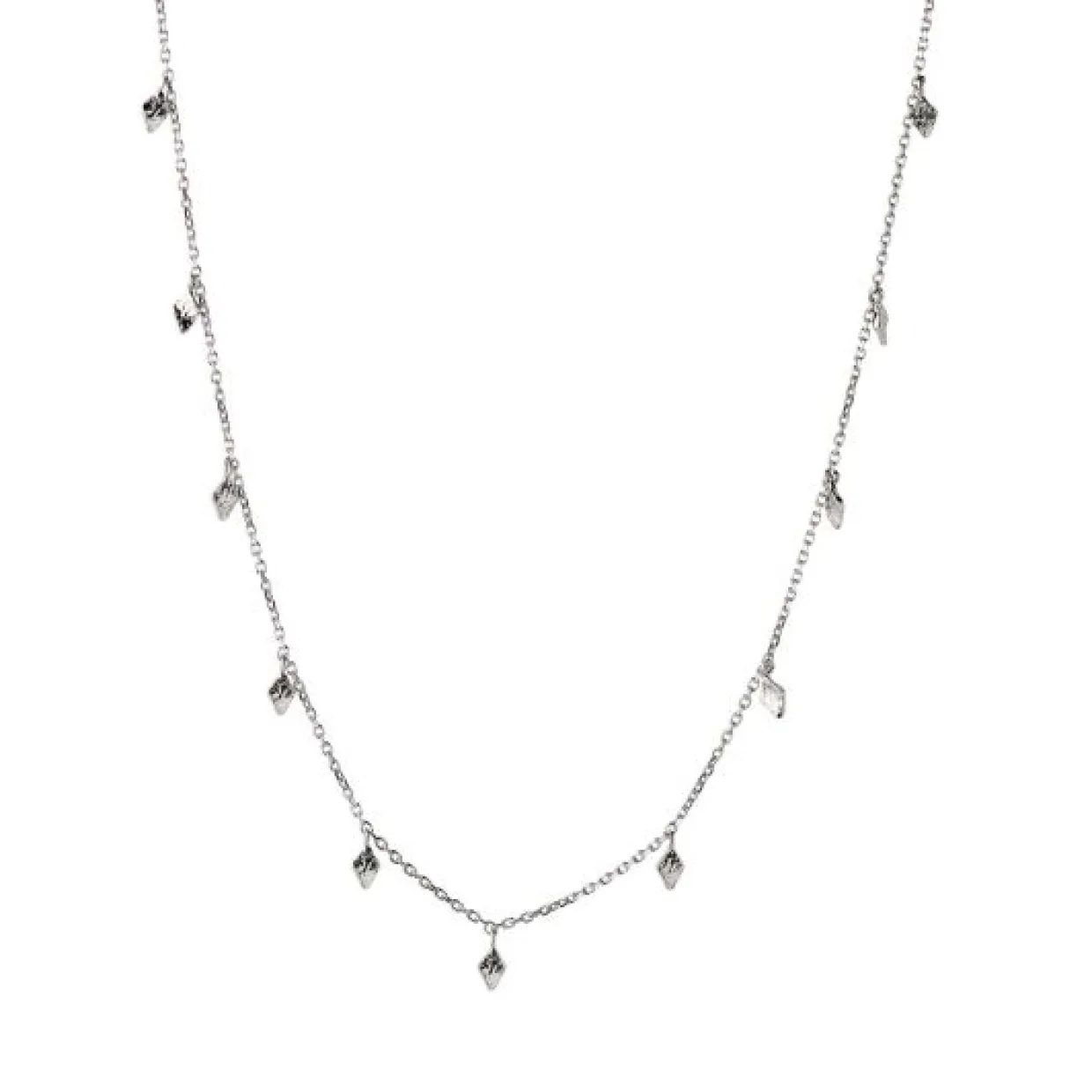 Smuk sølv halskæde med blade ned af kæden med en let banket overflade, der er 11 blade let fordelt i kæden.
