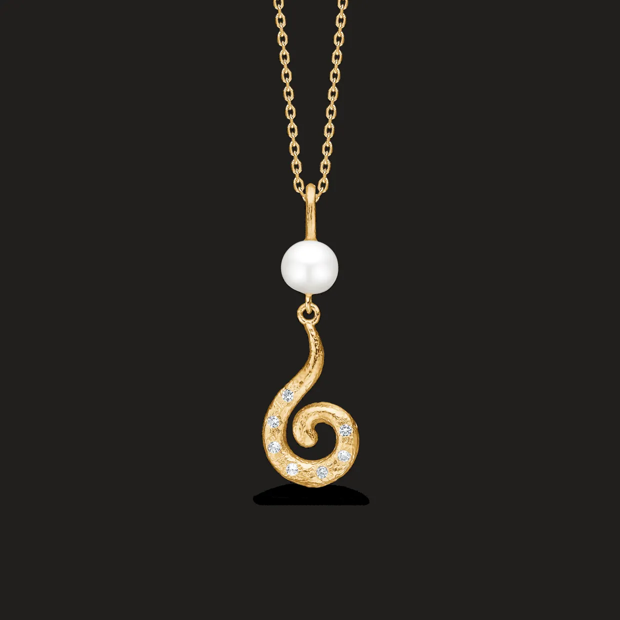 I toppen af det snirkel formede vedhæng sidder en kulturperle. Rundt i snirklen sidder hvide zirkonia sten.