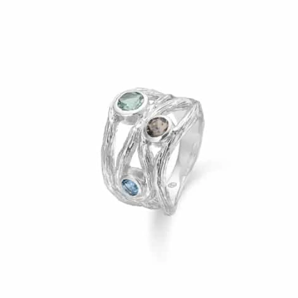 Sølv ring med farvede syntetiske zirkonia. Ringen er med en ruflet overflade, hvor de tre sten sidder fast mellem skinnerne i rørfatning.