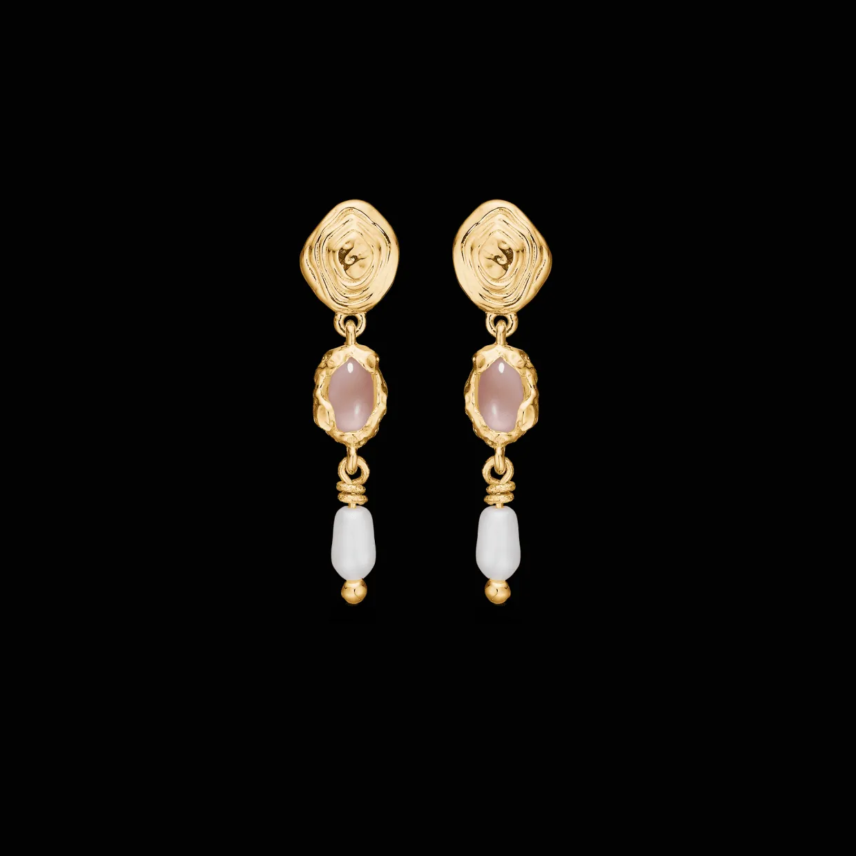 I midten af hver ørering sidder en smuk rosa farvet syntetisk zirkonia. Perlen harmonerer perfekt med det gyldne skalde look og tilsammen udstråler de elegance og naturlig skønhed. Øreringenes størrelse og design gør dem ideelle både til daglig brug og til mere formelle anledninger.