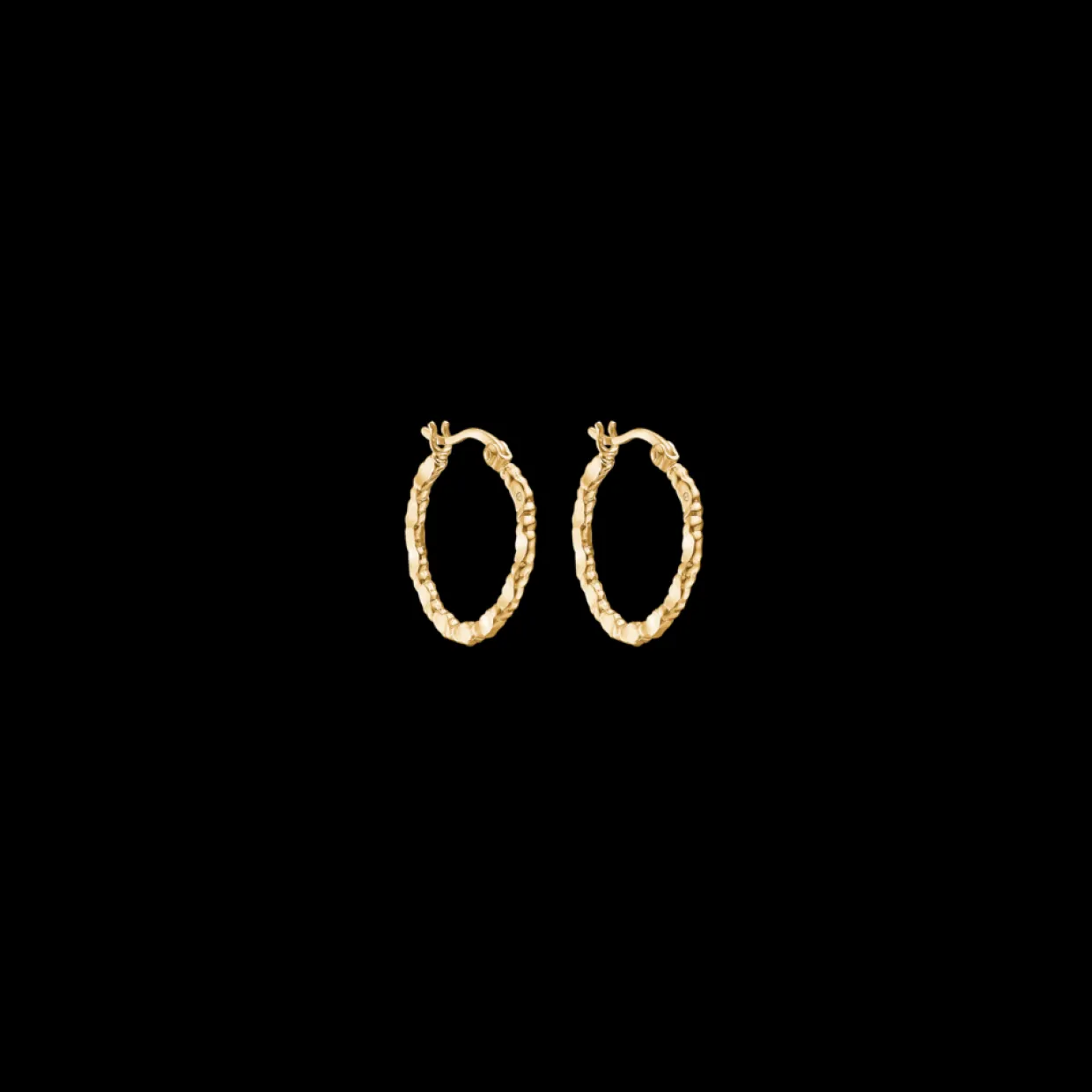 Sølv forgyldte øreringe som creol med ruflet overflade. Selve stikken er med hængsel, så de er lette at sætte i og tage af.