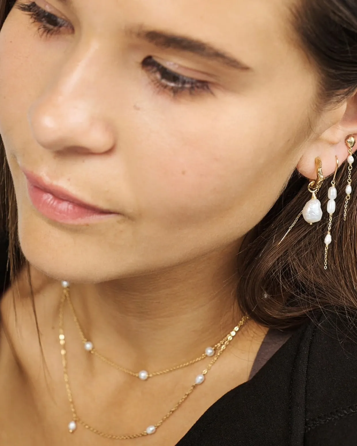 Halskæden er fremstillet i forgyldt sterling sølv med 8 hvide ferskvandsperler.