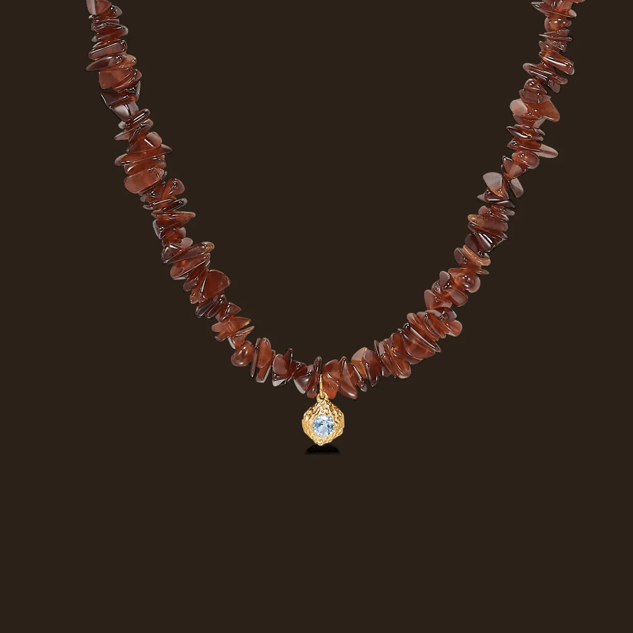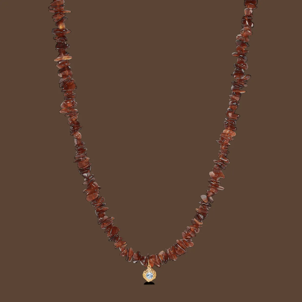Super fed halskæde med hessonit i flotte rød/brunlige natursten samt en lille charm i midten.