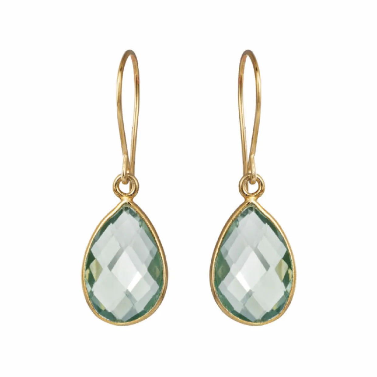 Disse smukke og elegante øreringe fra Susanne Friis Bjørner er udført i 14 karat rødguld. Øreringenes blikfang er to facetterede prasiolit dråbeformede sten i størrelsen 10×15 mm. Stenene er svag grøn og transparent, hvilket lader lyset stråler fremhæve farven.