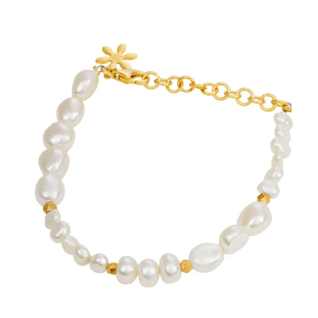 Enkelt, sofistikeret og elegant armbånd, som vil bære sig smukt til hverdags outfittet, eller til en pæn kjole til fest. Armbåndet er lavet af ferskvandsperler, samt små facet slebet sølv kugler som er blevet guldbelagt. Armbåndet måler 20 cm, men kan justeres op til 16 cm.