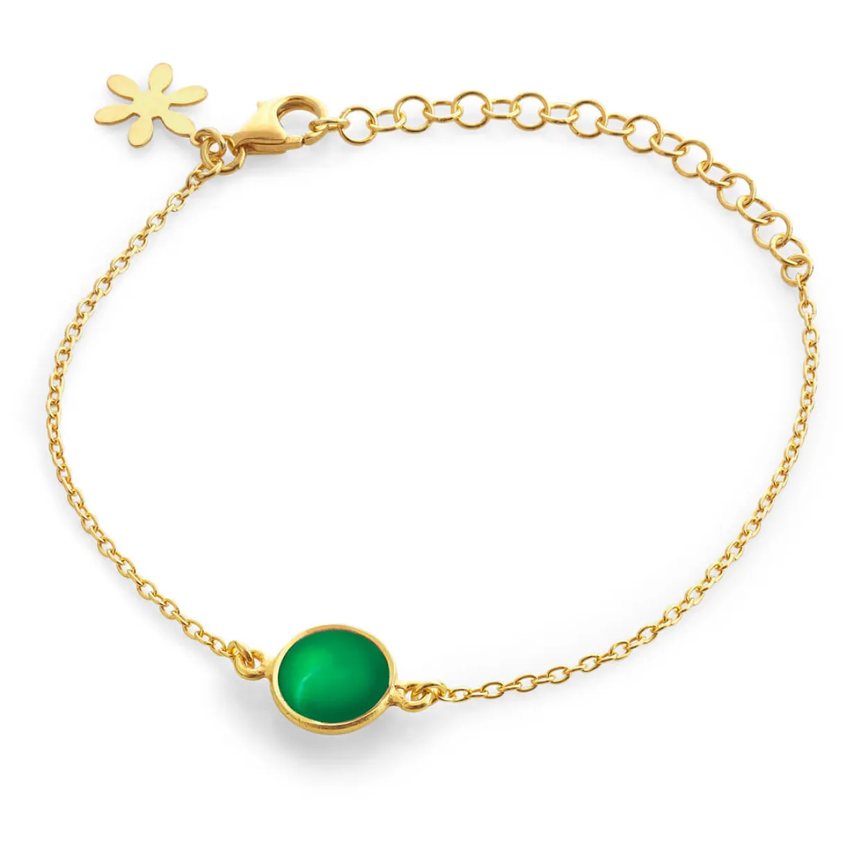 Susanne Friis Bjørner armbånd i 925 forgyldt Sterling sølv med en grøn agat sten. Armbåndet måler 16-20 cm, 16 cm og forlængerstykke for resten. Der findes både ring, ørestikker og vedhæng i serien også.