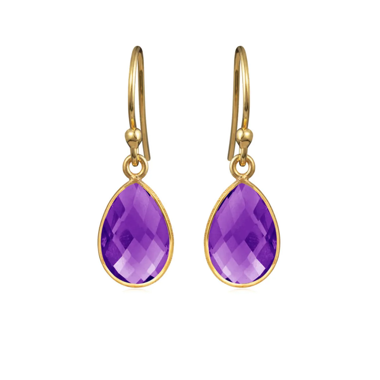 Smukke ørehængere i forgyldt sølv med facetteret lilla ametyst. Ametysten er dråbeformet og måler 8 mm i bredden og 12 mm i længden.
