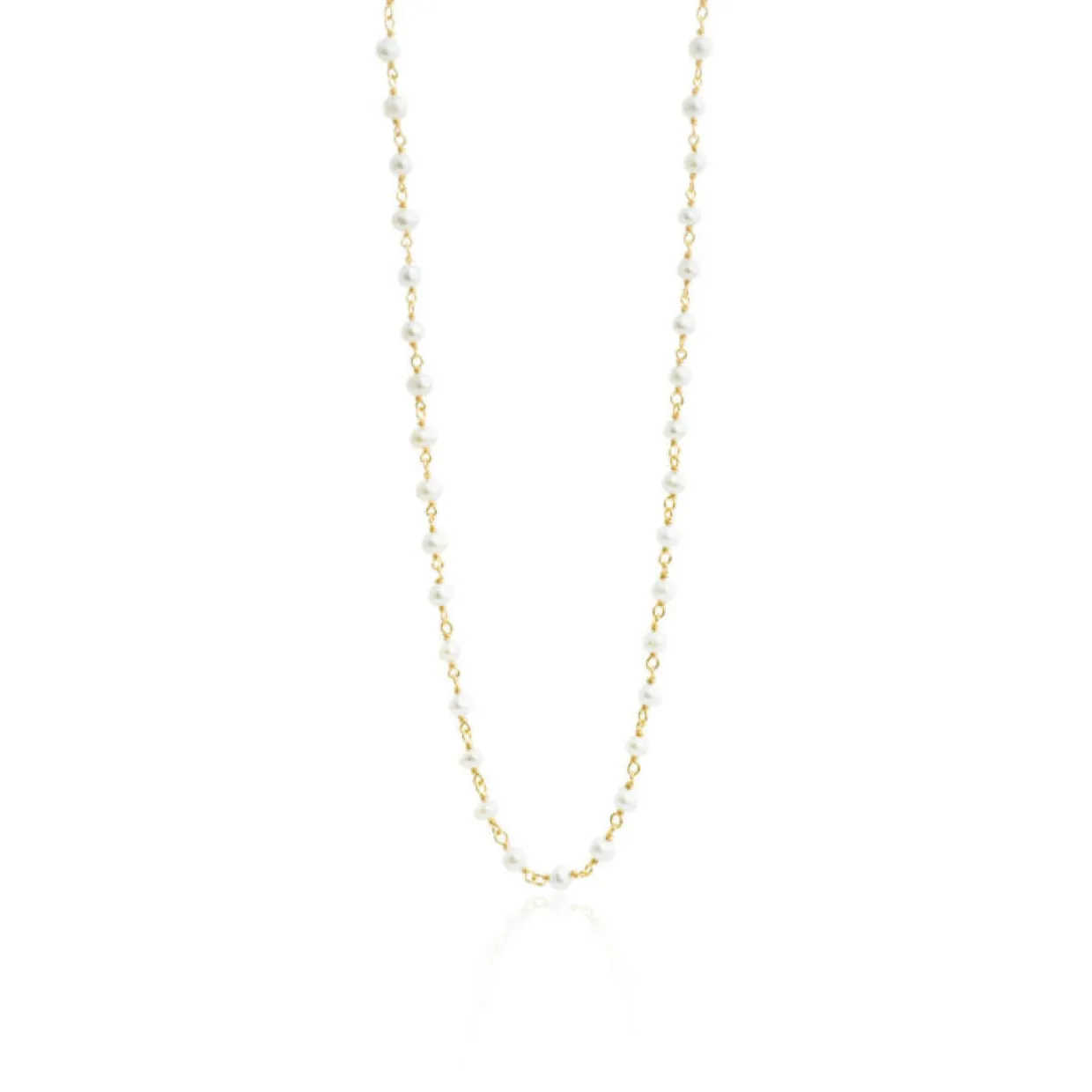 Denne helt enkelte kæde er skabt i unikke ferskvandsperler, der alle fremstår med mindre forskelle for det unikke look. Mellem perlerne er der sat små stykker med forgyldt sterling sølv. Meget smuk at kombinere med andre kæder for et personligt look.