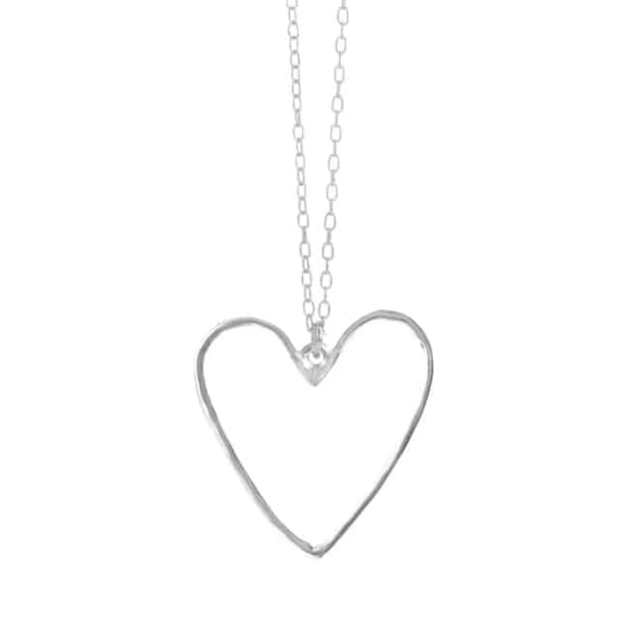 Fed halskæde i sølv med et stort hjerte i 25mm med hamret overflade. Til vedhænget medfølger en ankerkæde i sølv der kan reguleres i 42cm til 45cm. Ved låsen er en blomst, som er Susanne Friis Bjørneres logo og en fin detalje til designet.