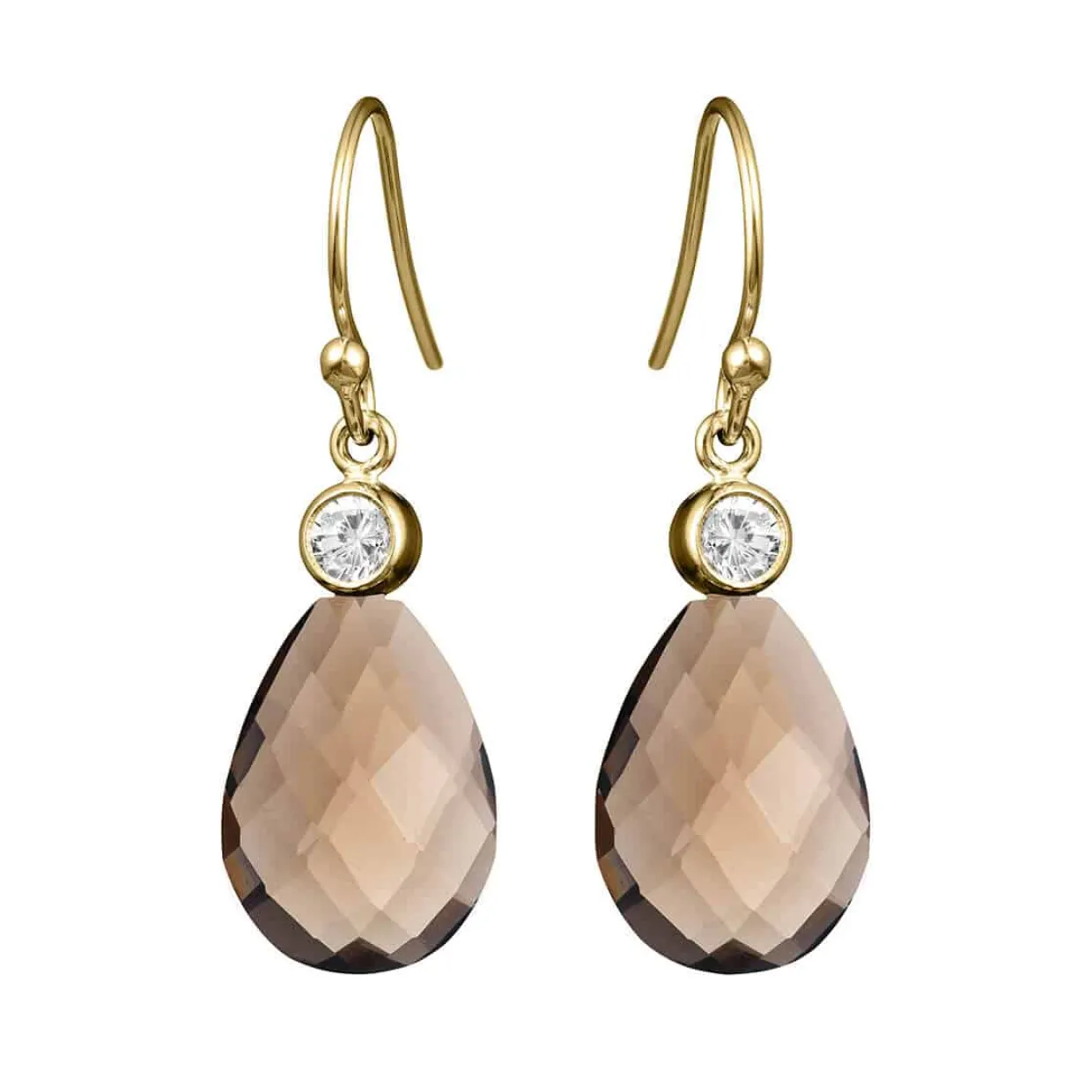 Flot ørehænger med en flot røg kvarts. Ørehængeren vil passe perfekt til hver en anledning. Ørehængeren er lavet ud af sterling sølv som er blevet forgyldt. Ørehængeren har en facetslebet røg kvarts samt en syntetisk hvid zirkonia. Øreringen måler 12×16 mm.