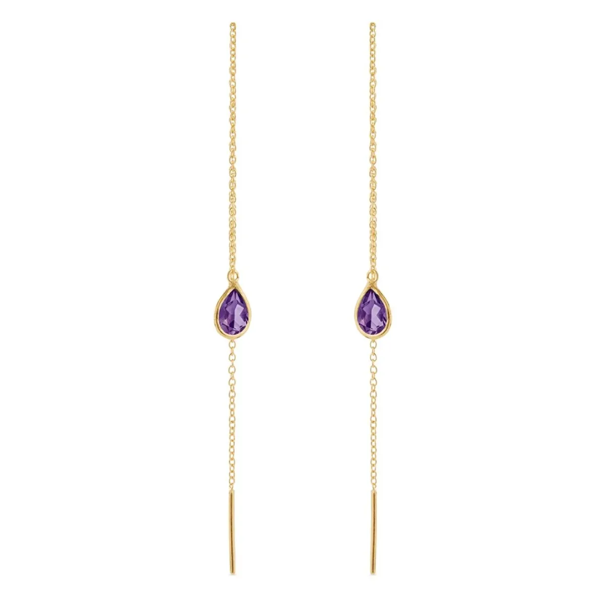 Smukke og elegante øreringe med en flot ametyst. Disse øreringe er lavet af en lang kæde, som skal føres igennem ørerings hullet. Øreringen kan dermed side i forskellige højder, alt efter hvad man selv ønsker. Ametysten er facet slebet, hvilket giver stenen et ekstra glimt. Øreringen er lavet af sølv som er blevet guldbelagt.