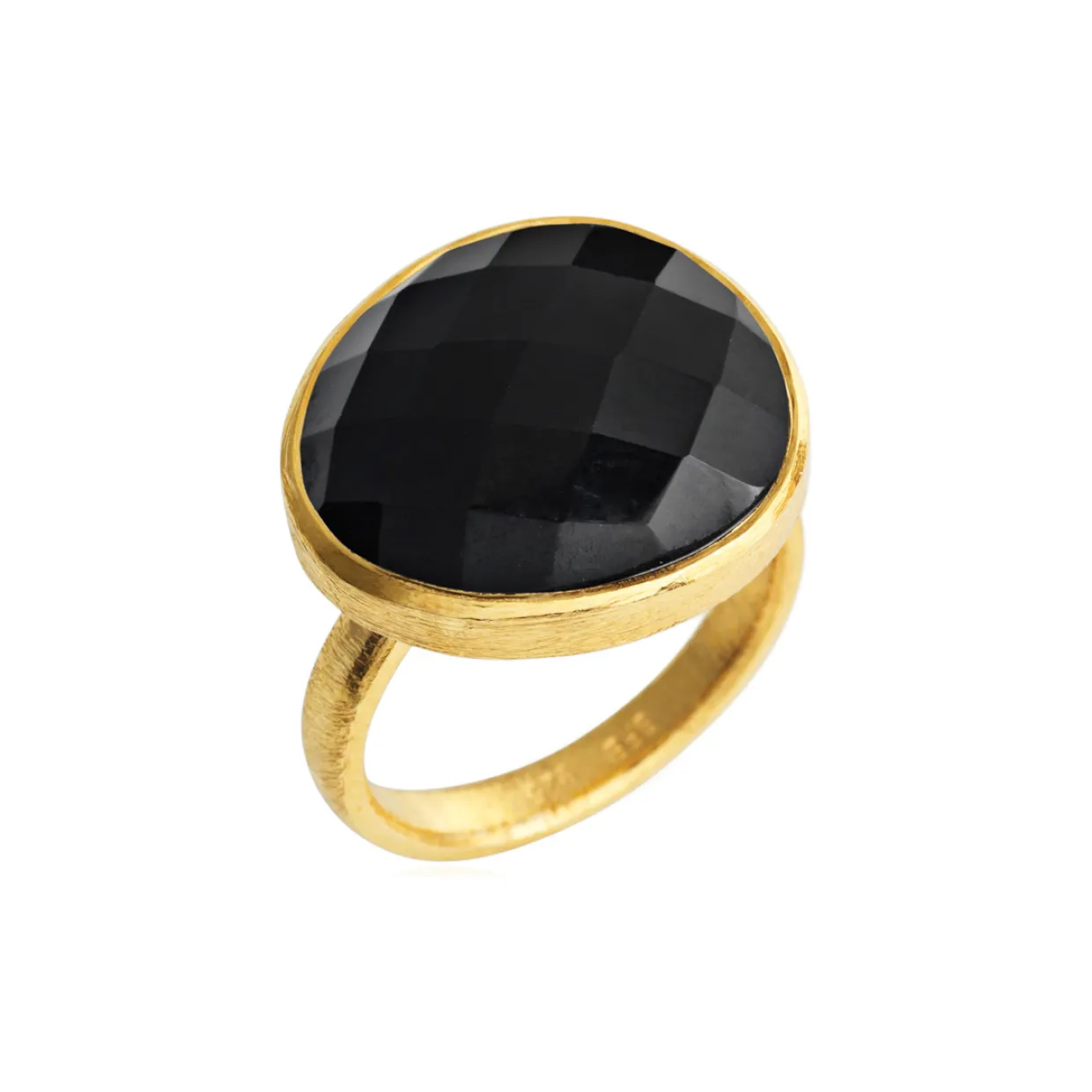 Ringen er fremstillet i forgyldt sterlingsølv. Ringens sten er en faceteret sort agat.