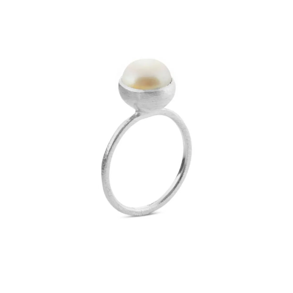 Ring fra Susanne Friis Bjørner i sterlingsølv med en cabochon-formet hvid ferskvandsperle. Perlen måler 8 mm i diameter.
