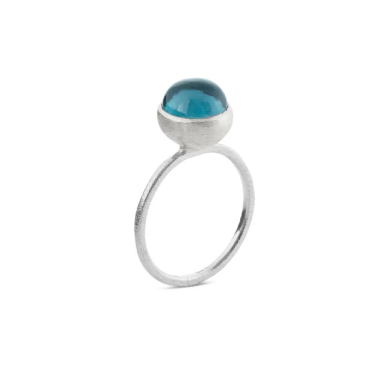 Ring fra Susanne Friis Bjørner i sterling sølv med en cabochon-formet blå krystal kaldet “London Blue Crystal”. Stenen måler 8 mm i diameter.