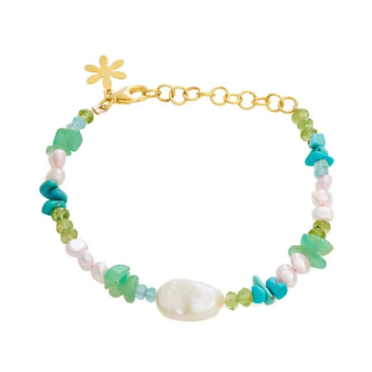 Mega fedt sommer armbånd fra Susanne Friis Bjørner med perler, turkiser, peridot og chrysoprase, et armbånd der bare udstråler sommer.
