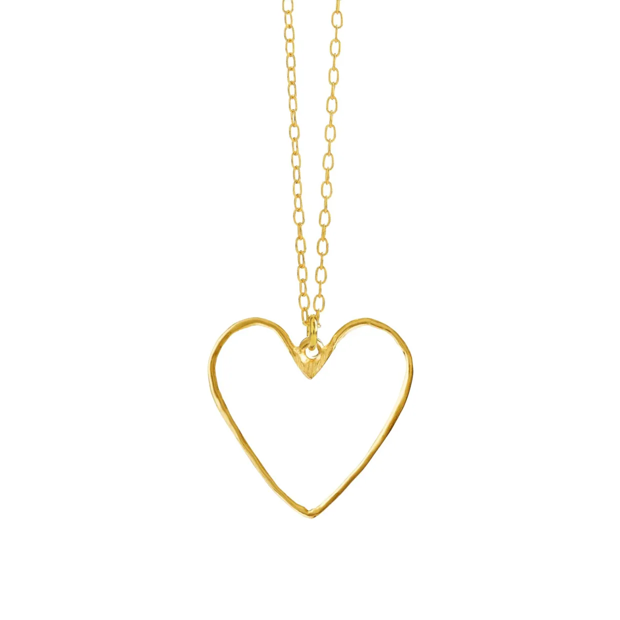 Dette flotte 20mm store hjerte, der er lavet som et omrids af et hjerte er skabt i sterling sølv med guld. Vedhænget er let hamret med en rustik overflade. Der følger en sterling sølv forgyldt ankerkæde med. Kæden kan reguleres fra længde 42cm til 45cm.