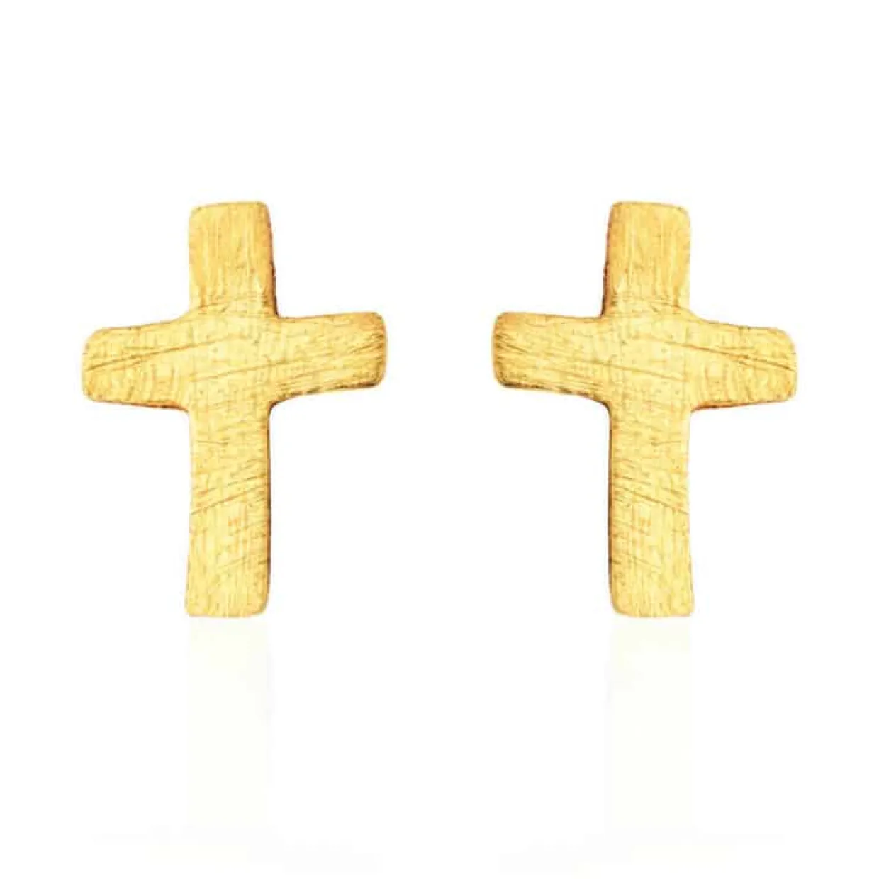 Sølv forgyldt øreringe på stik med kors. Korset har en mat overflade og et mål på 10 mm i højden og 7 mm i bredden.