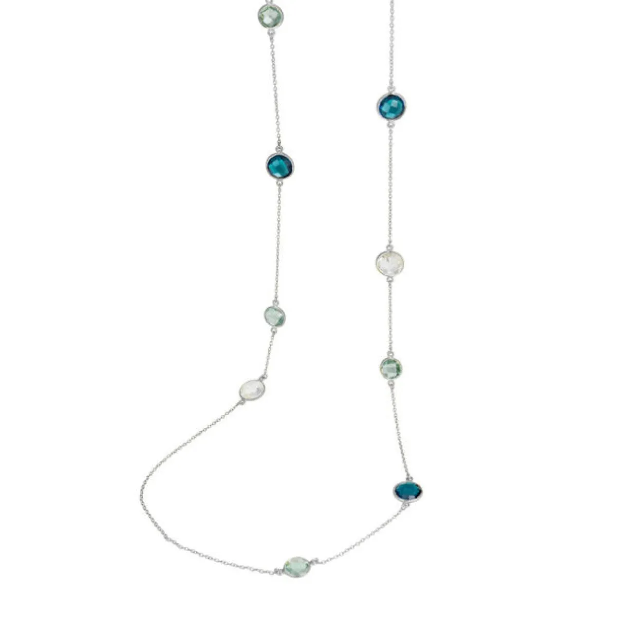 Smuk lang halsklæde med London blue krystal, rock krystal og grøn quartz, stenene er smuk facet slebne så de får et smukt glans i lyset