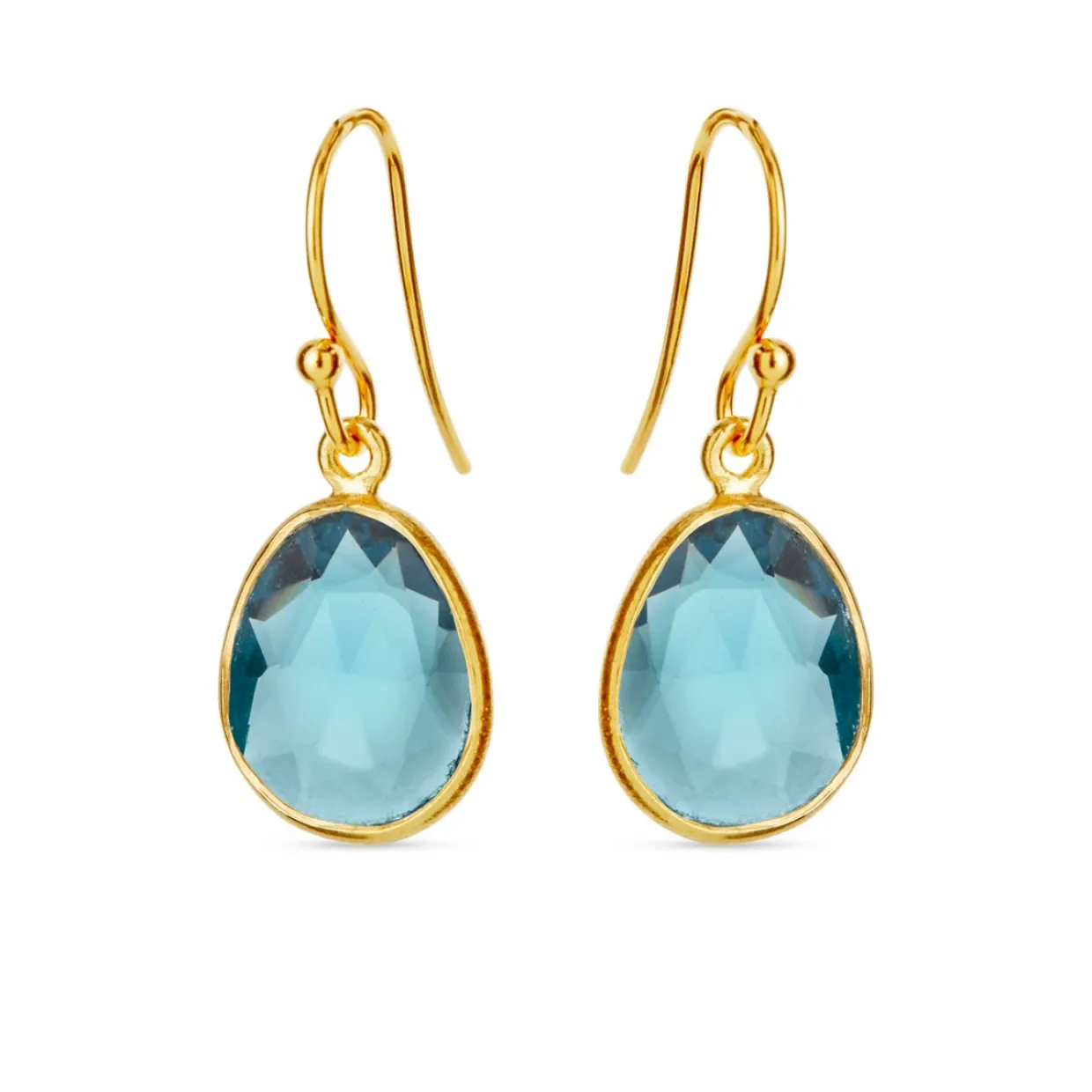 Smukke ørehængere i sølvforgylde med syntetisk blå topas. Stenen er facetslebne og måler 11 mm i bredden og 13 mm i højden. De fine øreringe er elegante nok til at kunne bruges til fest og simple nok til at kunne bruges til hverdag.