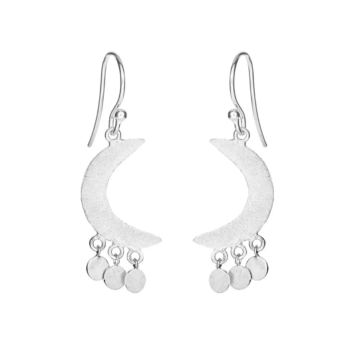 Super fine og ungdommelige ørehængere i sølv. På øreringene sidder der en halvmåne med 3 små, hængende mønter som giver liv og spil.